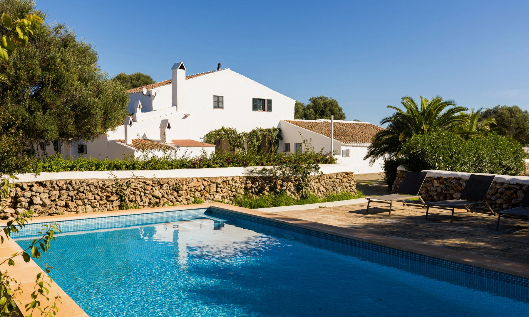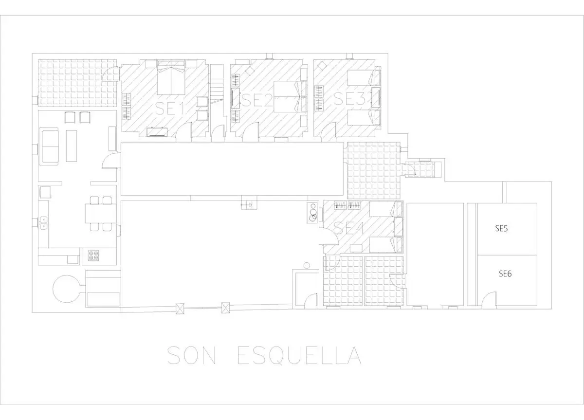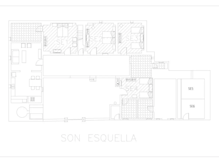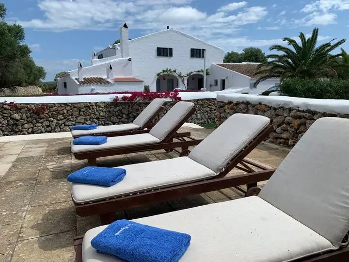 Son Esquella is an authentic Menorcan country house located between Son Bou and Cala en Porter, surrounded by over 100 hectares of nature. This traditional villa accommodates up to 17 guests in 9 bedrooms and 5 bathrooms, with 3 fully equipped kitchens, a 40 m² pool, garden, barbecue, indoor and outdoor dining areas, air conditioning, and a TV with Chromecast. Perfect for a stay in harmony with the Mediterranean surroundings, with cleaning and linen change services every 3 days.